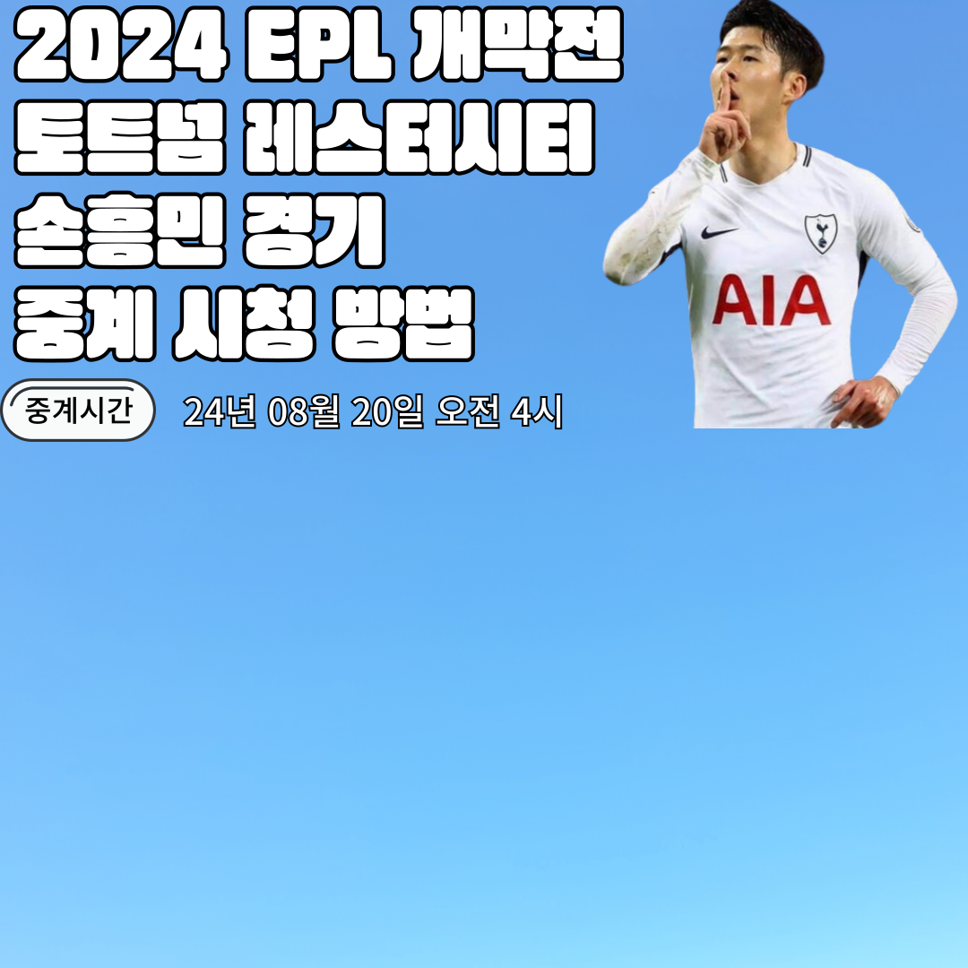 24-25 EPL 개막전, 토트넘과 레스터 시티의 경기가 8월 20일 오전 4시에 열립니다! 손흥민 선수의 활약을 놓치지 않으려면 지금 바로 SPOTV와 무료 중계 채널에서 실시간 중계를 확인하세요. 중요한 경기를 놓치지 않도록 준비하세요!